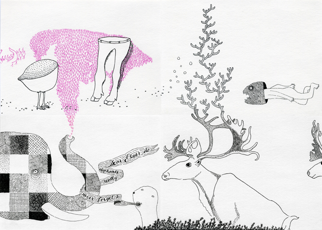 Exquisite corpse collaboration of YaYa and RoO: "Untitled Eight," 2007, 10"X14", ink on paper.
