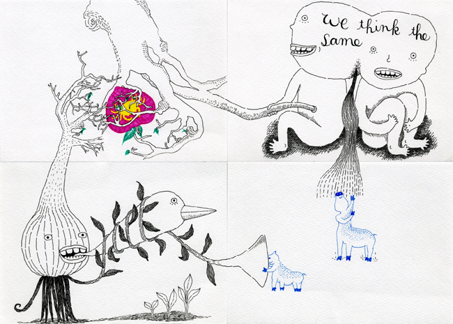 Exquisite corpse collaboration of YaYa and RoO: "Untitled Five," 2007, 10"X14", ink on paper.