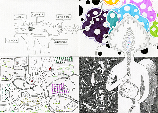 Exquisite corpse collaboration of YaYa and RoO: "Untitled Nine," 2007, 10"X14", ink on paper.
