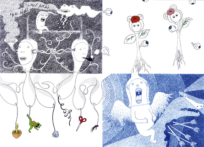 Exquisite corpse collaboration of YaYa and RoO: "Untitled Ten," 2007, 10"X14", ink on paper.