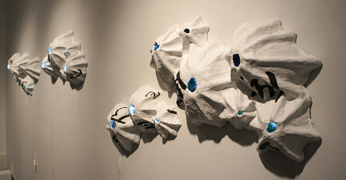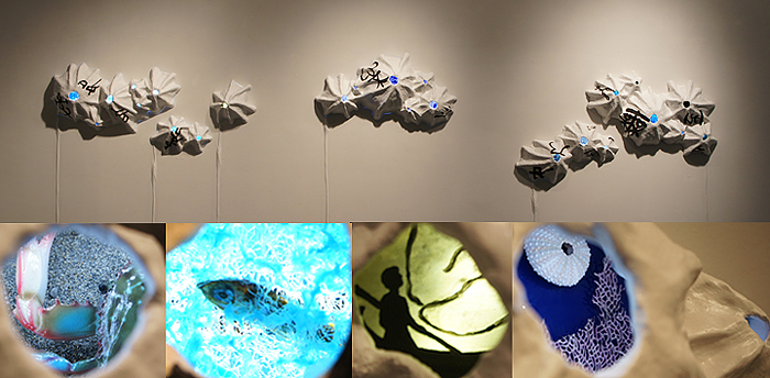 “Encrusted” is a site specific installation inspired by seashore landscape and islander cultures in Taiwan. It is the encrusted memory of my hometown. The installation consists of multiple sculptures in the shape of barnacle colonies. Each barnacle cluster is lit by LED lights and contains a miniature sculpture reflecting vignettes of human activities on and by the ocean.