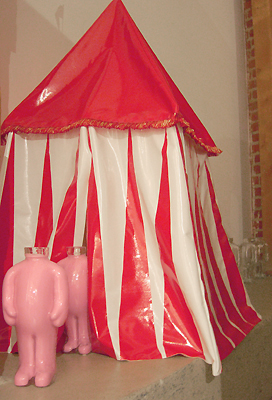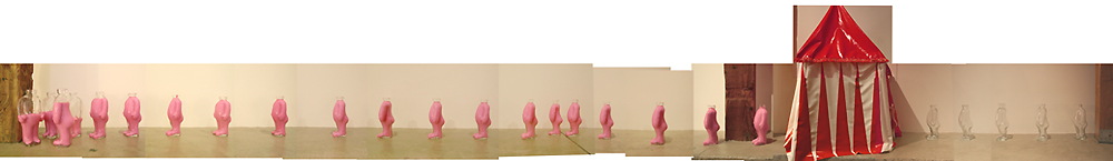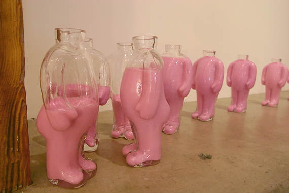 "Color Based"(detail), 2007, dimension variable, installation: circus tent, artist-designed glass bottles and pepto-bismol.