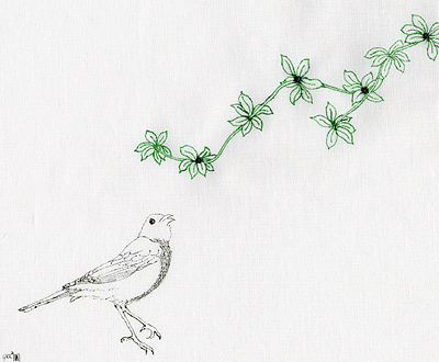 "Untitled 1," 2006, 6"X8", ink and beads on found cotton. Private Collection